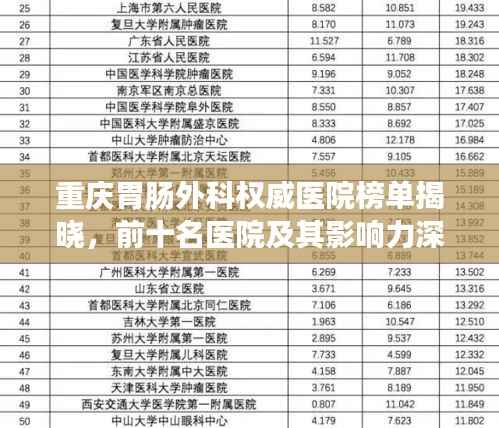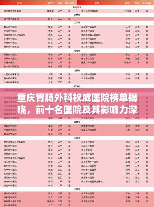 重庆,作为西南地区的重要城市,医疗水平一直处于领先地位,在众多医疗领域,胃肠外科尤为突出,本文将为您介绍重庆胃肠外科排名前十的医院及其影响力。