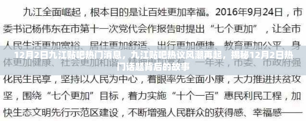 在喧嚣的网络世界中,九江贴吧一直是九江地区网民们交流信息、分享生活的重要平台,而每到特殊的日子,它总能汇聚起一股股热议的浪潮,就在12月2日,九江贴吧再次成为众多网友关注的焦点,一系列热门消息在这里迅速传播,引发了广泛而热烈的讨论,本文旨在回顾这一天的热门话题背景,梳理重要事件,分析其影响,以及在特定领域或时代中的独特地位。